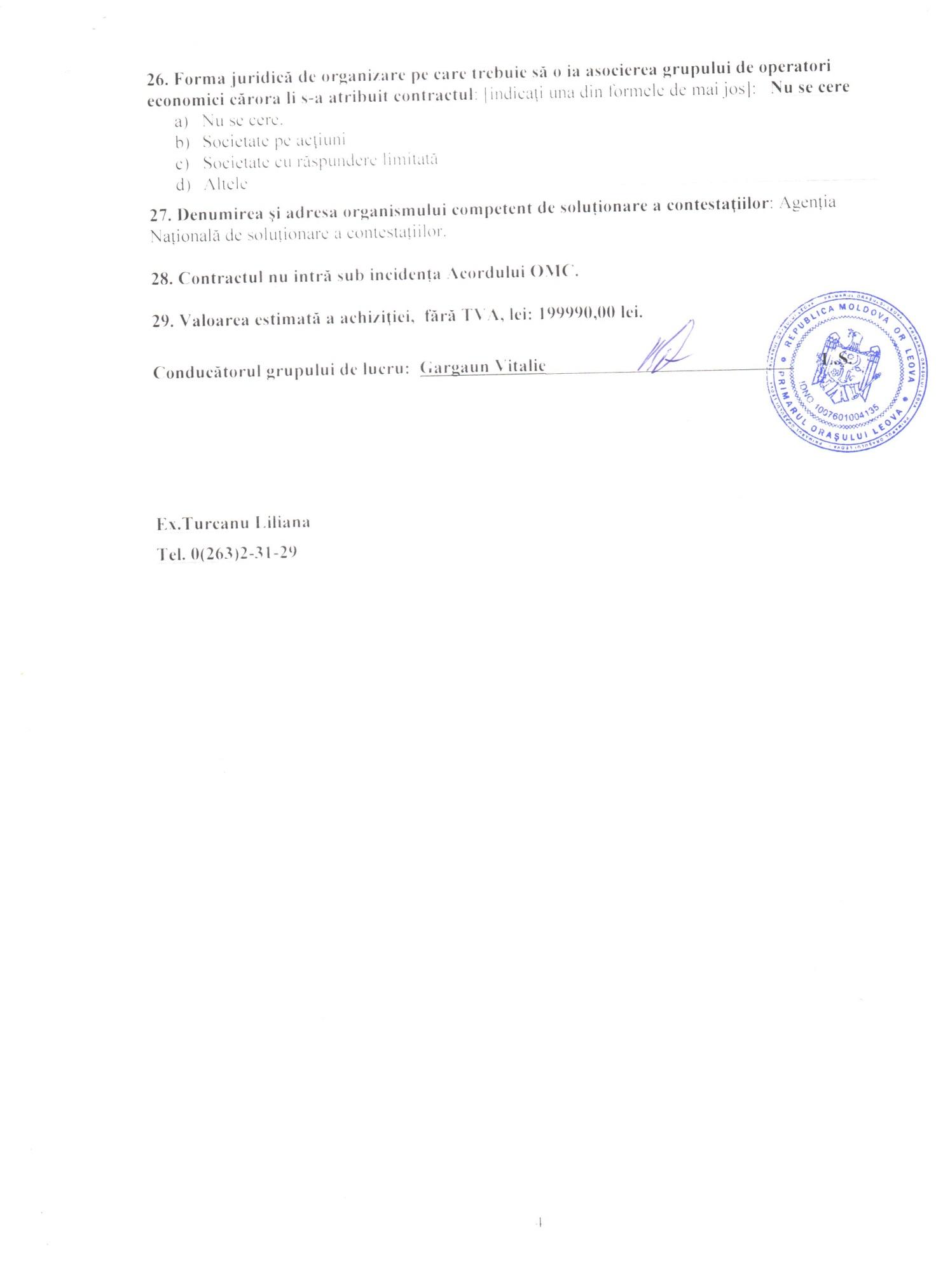 19. Operatorii economici interesaţi pot obţine informaţie suplimentară de la autoritatea contractantă şi familiariza cu cerinţele documentației de atribuire la adresa indicată mai jos: a) Denumirea autorităţii contractante: Primaria Leova or.Leova b) Adresa: or.Leova str.Unirii 22 c) Tel: 0(263)2-31-29 d) Fax: 0(263)2-22-06 e) E-mail:liliana.prim2010@mail.ru f) Numele şi funcţia persoanei responsabile ;sp.Turcanu Liliana Setul de documente poate fi obținut la aceeaşi adresă, după depunerea cererii de participare (cu indicarea clară a denumirii, adresei, numărului telefonului de contact şi numelui persoanei împuternicite de către Participant). Adițional setul de documente poate fi obținut on-line la adresa: www.Primaria Leova.md În cazul obținerii setului de documente din resursele on-line, agentul economic poate depune cererea de participare în conformitate cu Art. 32(4) a Legii Nr. 131 din 03.07.2015 privind achizițiile publice.