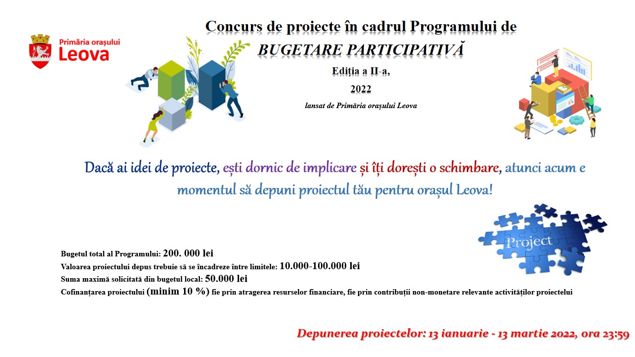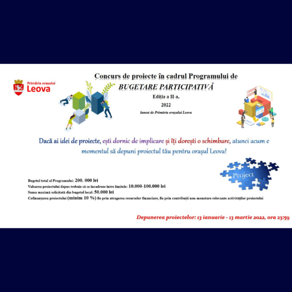 Pentru Programul de Bugetare Participativă din orașul Leova, ediția 2022 este prevăzută o sumă de 200. 000 de lei. Valoare sumei solicitate din bugetul local nu va depăși 50. 000 lei.