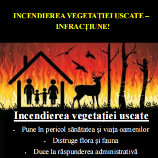 În condiţii de temperaturi ridicate şi umeditate redusă, orice sursă de aprindere poate genera incendii. Persoanele care aleg să igienizeze gospodăriile, sunt rugate să nu lase nesupravegheate arderile resturilor menajere şi vegetaţiei uscate, pentru a evita extinderea incendiilor. Un pericol în acest sens, îl prezintă casele de locuit şi spaţiile forestiere aflate în nemijlocită apropiere. În cazul în care sînt observate aceste focare, este necesar să fie apelat Serviciul 112.