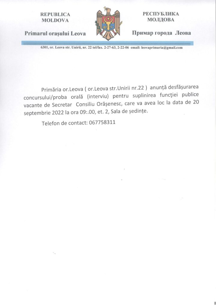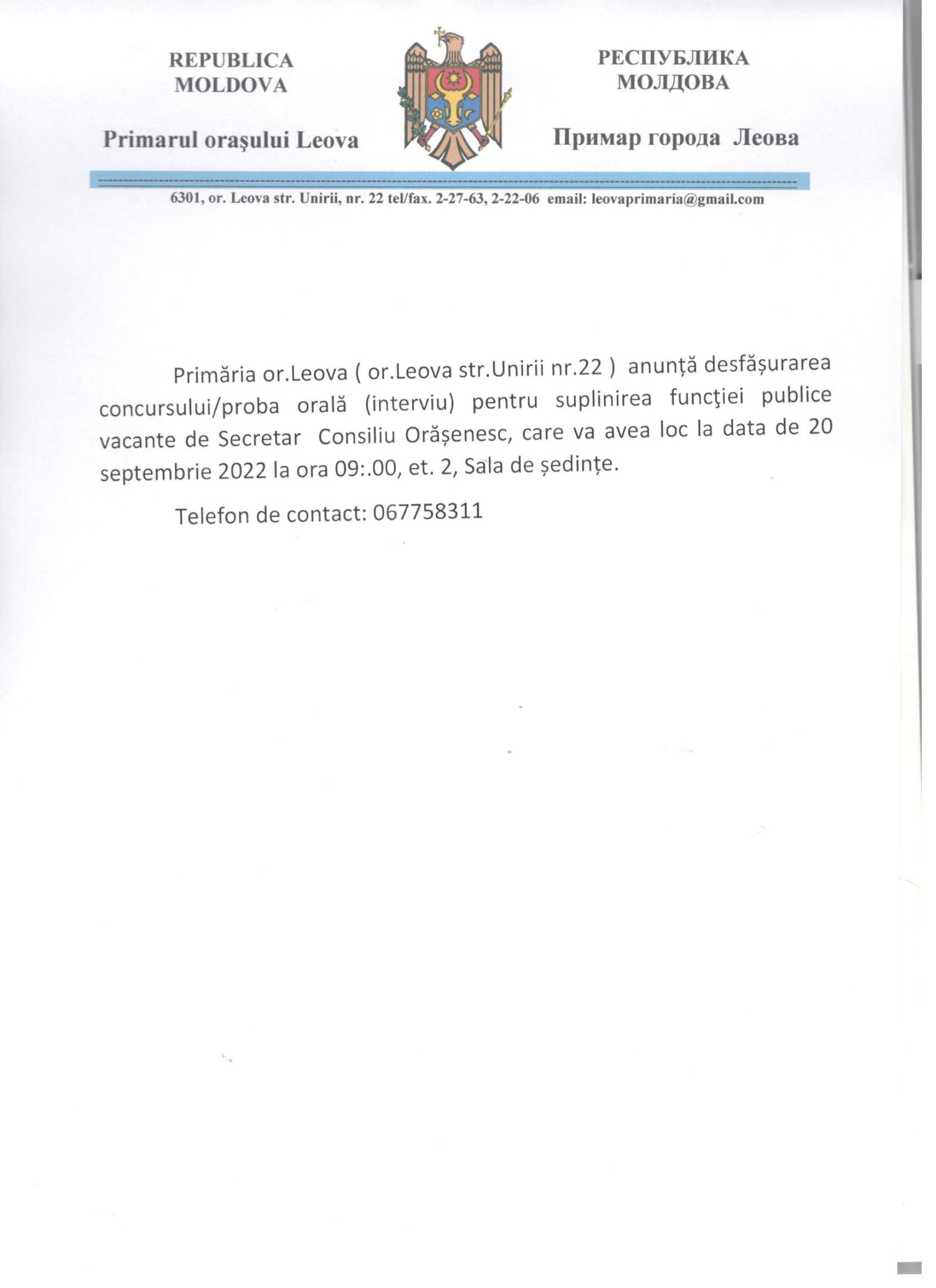 Desfășurarea concursului/proba orală pentru funcția publică vacantă de Secretar Consiliu Orășenesc