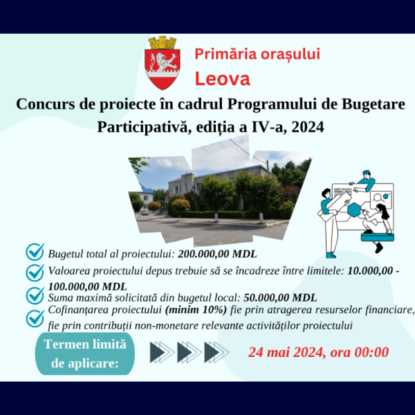 Programul de Bugetare participativă continuă la de-a IV-a ediție pentru anul 2024 și își propune implicarea cetățenilor orașului Leova într-un proces democratic pentru stabilirea modalității optime de valorificare a surselor financiare din bugetul local.
