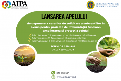În temeiul pct. 25-28 din Regulamentul privind condițiile și procedura de acordare a subvențiilor în avans pentru proiectele investiționale de îmbunătățiri funciare, întru implementarea Programului de îmbunătățiri funciare, în scopul asigurării managementului durabil al resurselor de sol pentru anii 2021-2025, aprobat prin Hotărârea Guvernului nr. 985/2020, Agenția Națională de Îmbunătățiri Funciare, anunță că în conformitate cu Ordinul Agenției Națională de Îmbunătățiri Funciare nr. 4 din 20 ianuarie 2025, a fost lansat apelul de depunere a cererilor de acordare a subvenției în avans pentru proiectele investiționale de îmbunătățiri funciare, ameliorare și protecție a solului, iar termenul limită de depunere a cererilor este 28 februarie 2025.
