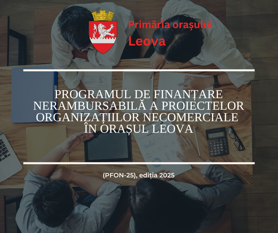 Consiliul orășenesc Leova anunță lansarea Concursului de finanțare nerambursabilă a proiectelor organizațiilor necomerciale în orașul Leova în cadrul Programului de finanțare nerambursabilă a proiectelor ON în orașul Leova, ediția 2025 (PFON-25).