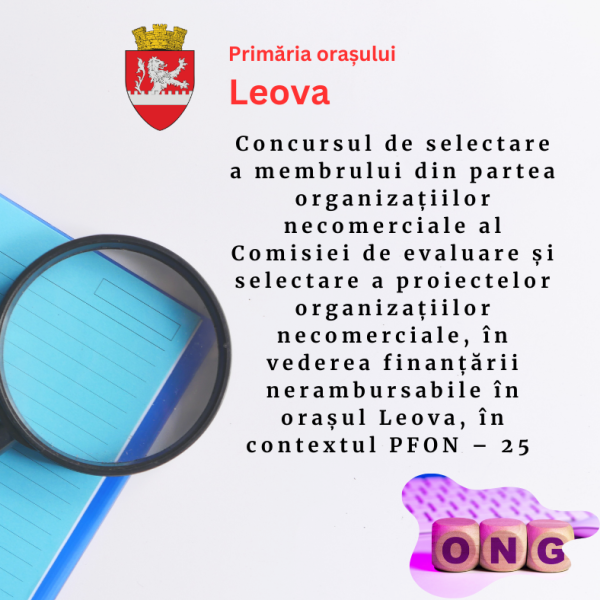 Primăria orașului Leova anunță lansarea Concursului de selectare a membrului din partea organizațiilor necomerciale al Comisiei de evaluare și selectare a proiectelor organizațiilor necomerciale în vederea finanțării nerambursabile în orașul Leova, în contextul Programului de finanțare nerambursabilă a proiectelor ON în orașul Leova, ediția 2025 (PFON-24), în conformitate cu dispoziția Primarului nr.95 din 25.03.2025.