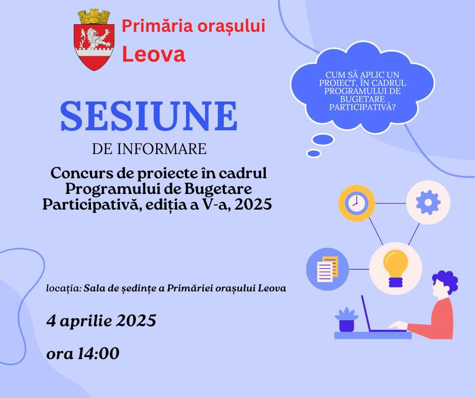 Primăria orașului Leova vă invită să participați la sesiunea de informare privind Programul de Bugetare Participativă, ediția 2025, unde veți afla cum puteți propune și aplica proiecte pentru dezvoltarea comunității noastre.