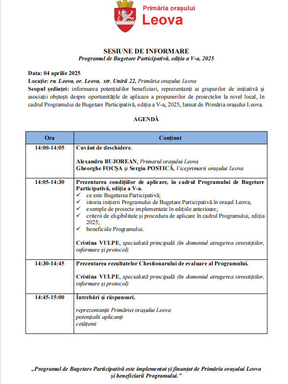 ANUNȚ Sesiune de Informare: Programul de Bugetare Participativă, ediția a V-a, 2025, lansat de Primăria orașului Leova