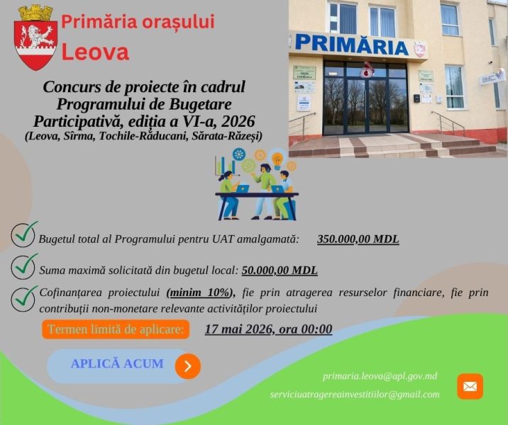 Pentru Programul de Bugetare Participativă din orașul Leova UAT amalgamată, ediția 2026 este prevăzută o sumă de 350.000,00 de lei. Valoare sumei solicitate din bugetul local nu va depăși 50.000,00 lei, iar contribuția aplicanților sau partenerilor (sub diferite forme) nu mai mică de 10 % din valoarea totală a proiectului.