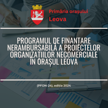 Consiliul orășenesc Leova anunță lansarea Concursului de finanțare nerambursabilă a proiectelor organizațiilor necomerciale în orașul Leova în cadrul Programului de finanțare nerambursabilă a proiectelor ON în orașul Leova, ediția 2024 (PFON-24). Scopul PFON-24 este motivarea ON în desfășurarea activităților de utilitate publică, spre beneficiul cetățenilor și dezvoltarea orașului Leova. Obiectivele specifice și domeniile prioritare de finanțare. Consiliul […]